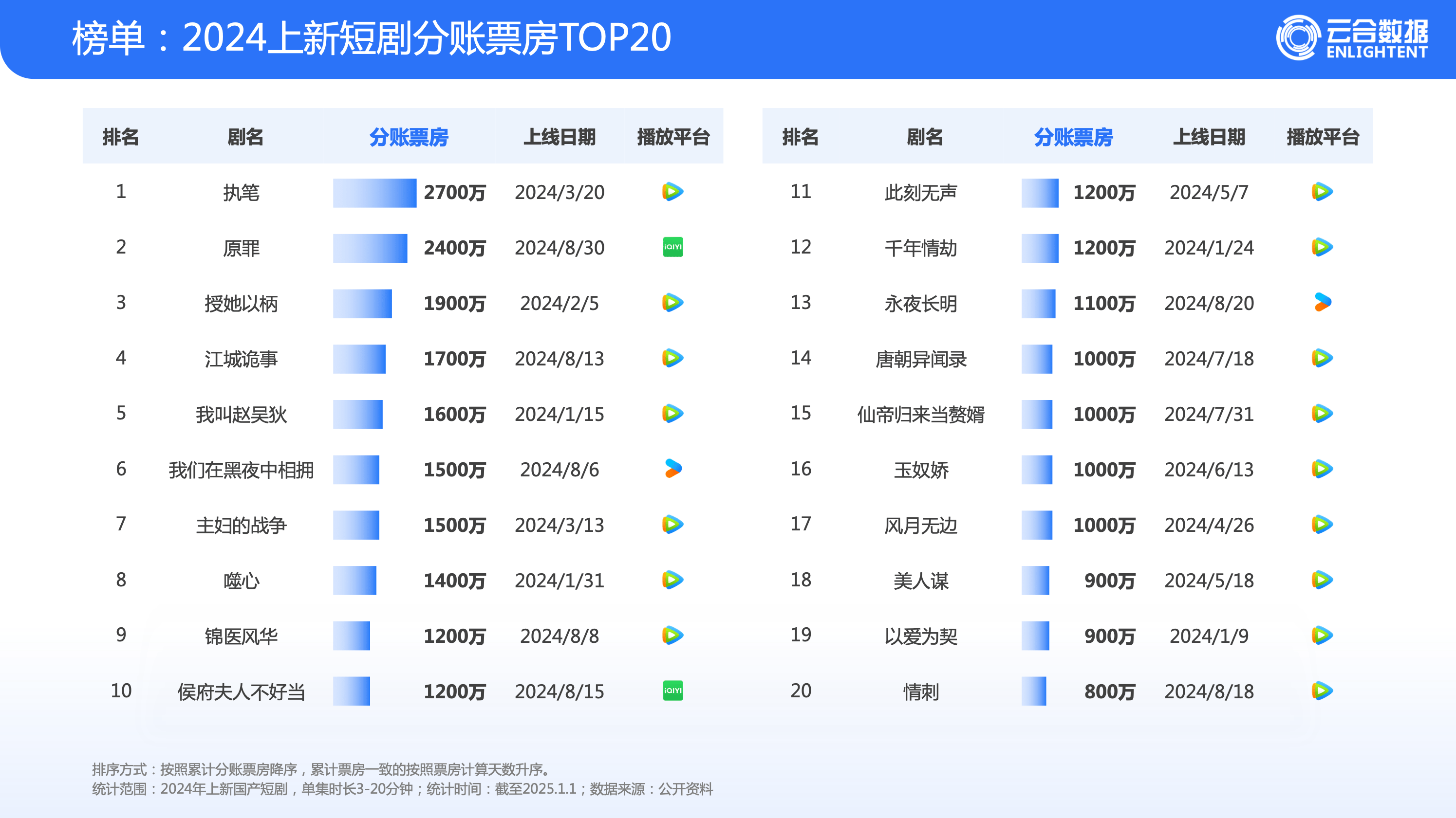 其中,《执笔》以2700万票房位居第一,较2023年票房TOP1(《招惹》)的票房增加700万。此外,10部短剧票房在500-900万,15部票房在200-400万,16部短剧票房破100万。
