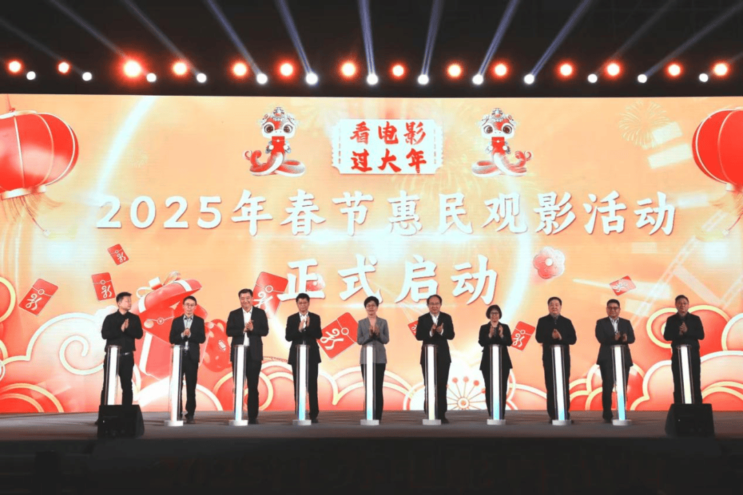 活动现场,中共江苏省委常委、宣传部部长徐缨,中宣部电影局主持日常工作的副局长毛羽,扬州市委书记王进健,中国电影资料馆馆长、中国电影艺术研究中心主任孙向辉,江苏省财政厅副厅长倪国强,江苏省广播电视总台党委书记、台长、集团董事长葛莱,江苏省电影集团董事长邵正刚,猫眼娱乐副总裁齐文博,淘票票副总经理姜维知,中国银联江苏分公司副总经理单文欣共同启动了“看电影、过大年”江苏省春节惠民观影活动。