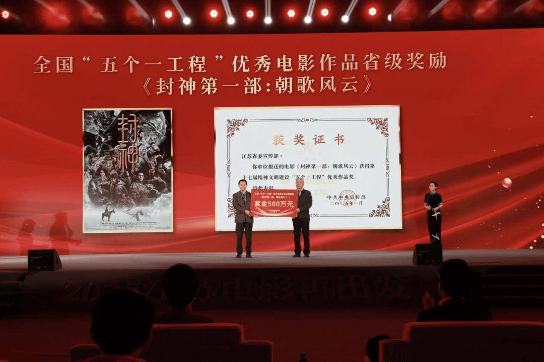 江苏省委宣传部常务副部长、省电影局局长梁勇代表江苏省委宣传部向荣获第十七届中宣部精神文明建设“五个一工程”奖的《封神第一部:朝歌风云》颁发了奖励。《封神第一部:朝歌风云》片方代表、北京京西文化旅游股份有限公司总裁严雪峰表示:“主管部门的关心支持和广大观众的热情喜爱,一直激励着我们不断前进。目前,《封神第二部:战火西岐》已经定档大年初一,也将在全球同步上映,我们会继续大力弘扬中华传统文化,向世界讲述中国故事。”