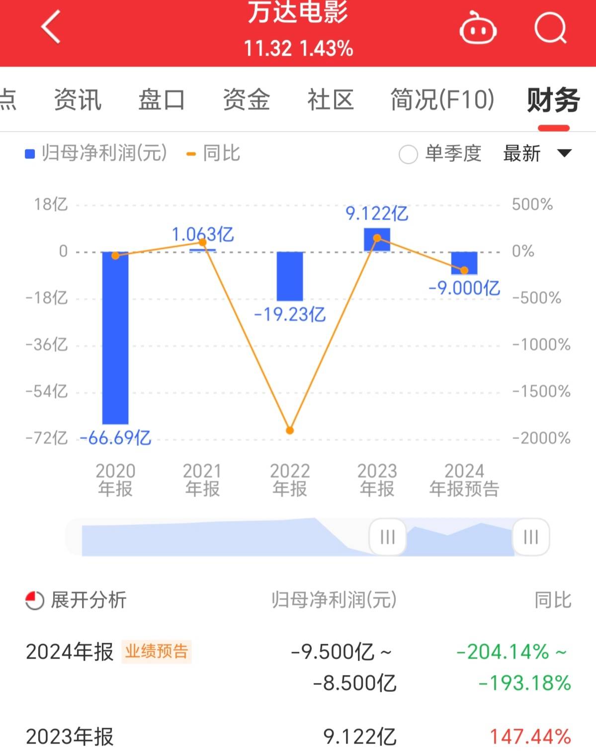 搜狐娱乐讯 (哈麦/文)上市公司万达电影发布业绩预告,2024年净利润预计亏损8.5-9.5亿元,上年同期为盈利9亿元。