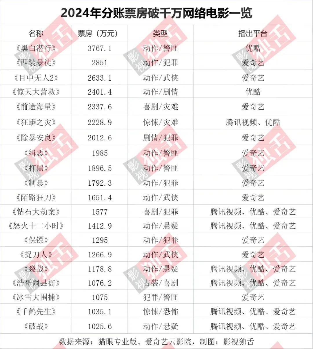 值得注意的是,2024年分账票房破千万的网络电影中,没有一部是腾讯视频独播。