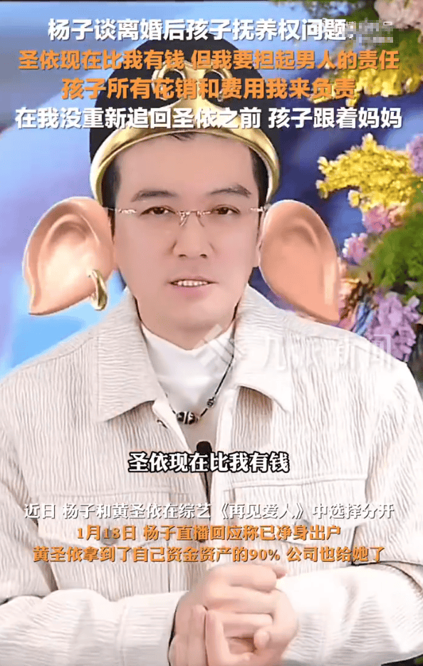 近日,杨子和黄圣依在综艺《再见爱人》中选择分开。1月18日,杨子直播回应称已净身出户,黄圣依拿到了自己资金资产的90%,公司也给她了。谈及离婚后孩子抚养权问题,杨子表示,“圣依现在比我有钱,但我要担起男人的责任,孩子所有花销和费用我来负责,在我没重新追回圣依之前,孩子跟妈妈。”