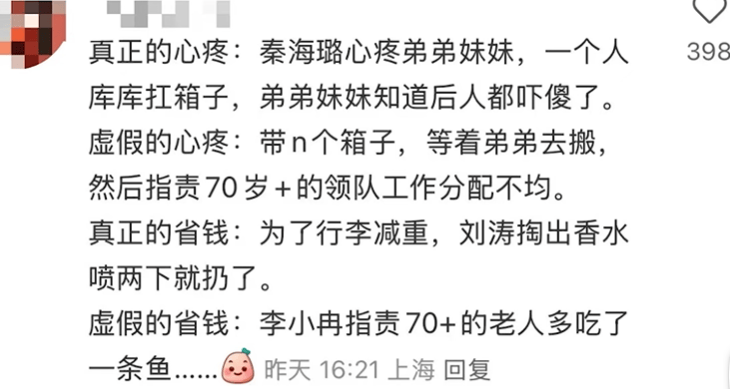 网友审判李小冉的点在于,她没嫌行李超支6900,却嫌庆奶吃了条100多的鱼。