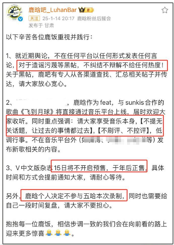 目前鹿晗方传递出了几大信息,第一,他不会参加新一季《五哈》的录制了。
