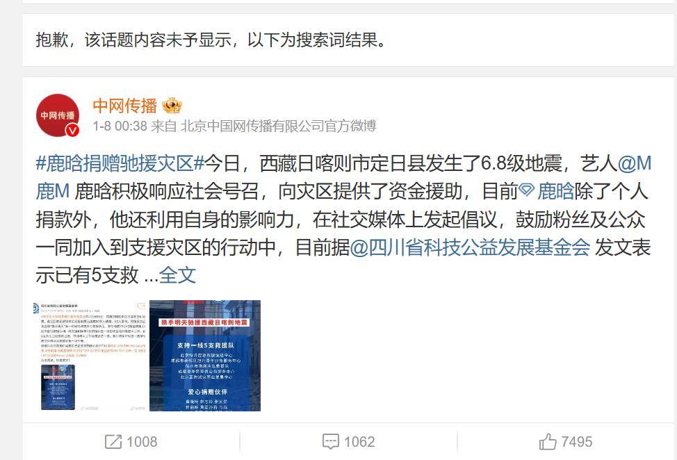 还有网友发现,鹿晗之前在西藏地震时捐了款,粉丝创建了话题,话题却处于“不予显示”状态,这也很不同寻常,导致很多网友猜测鹿晗是不是出了什么大事。