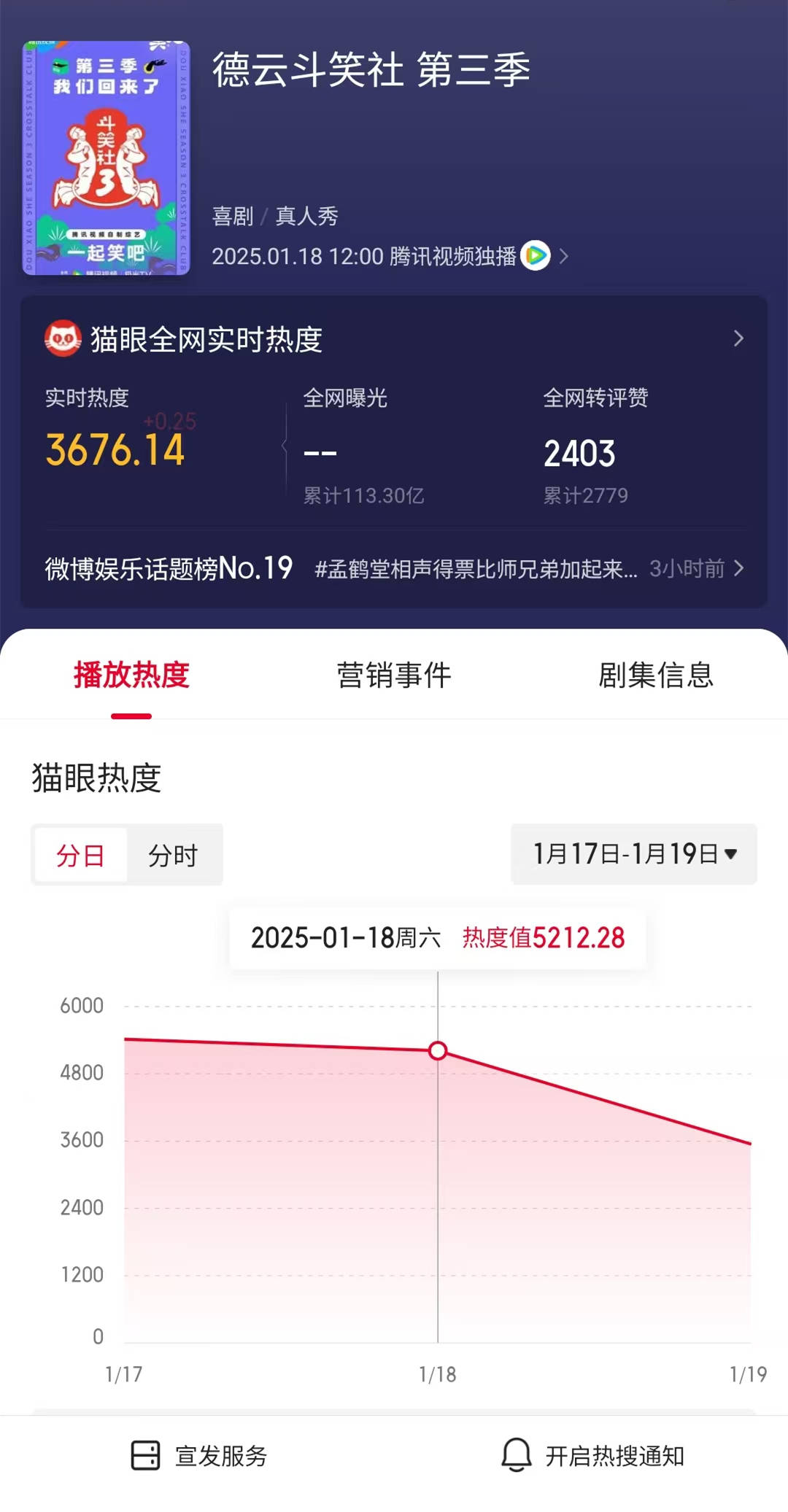 一档喜剧综艺节目,腾讯视频在综艺版面给足了排场,头版头条位置。按理说,这样的喜剧综艺,上线一天,不能说热度夺冠吧,至少热度也得前三名吧。可是,猫眼专业版方面的数据显示,《斗笑社3》上线满一日,热度持续走跌,不仅没有热度前三,甚至于连猫眼专业版综艺热度的前30都没进去。