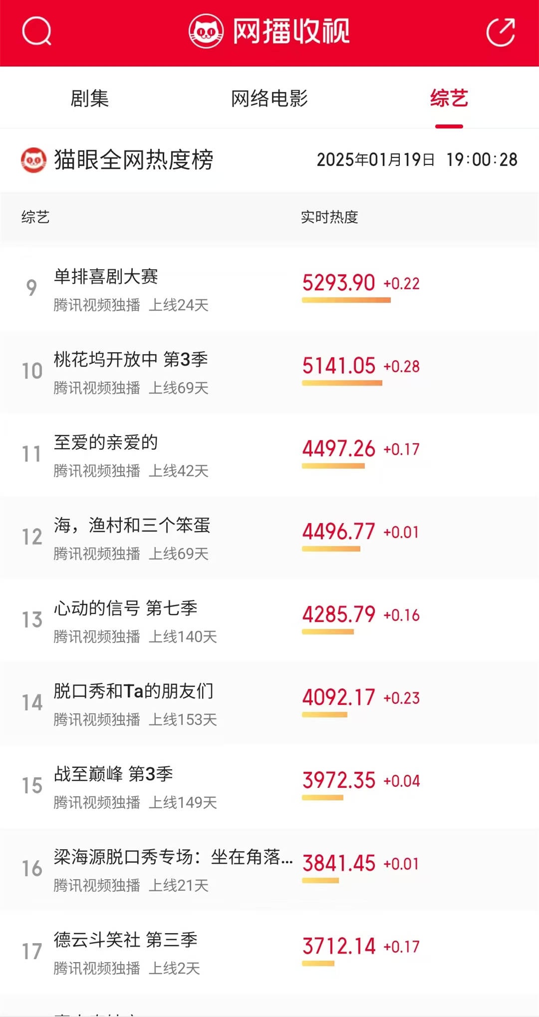 那么,《斗笑社3》的网络热度,到底低到什么程度呢?没有进入综艺榜单的前30,可进入到腾讯视频综艺榜单的前30了呢?猫眼专业版,1月19日晚间7点的数据显示,《斗笑社3》在腾讯视频综艺的热度榜单当中,排名第17位。排在第16位置的,是已经上线21天的《梁海源脱口秀专场》。