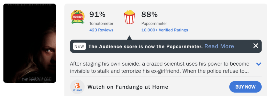 影片烂番茄开局新鲜度60%,但是现在掉到了53%,爆米花指数也只有59%,属于虽然并没有特别烂,但是的确比较平庸的水准,特别是在他之前两部电影的烂番茄评分都非常出色的情况下,看来这次雷·沃纳尔的点子并没有让人信服。