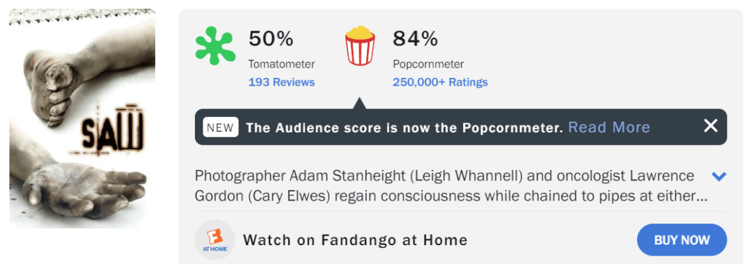 当然,值得一提的,当初雷·沃纳尔撰写故事、温子仁执导的《电锯惊魂1》烂番茄新鲜度也不高,只有50%,爆米花指数倒是够高的。