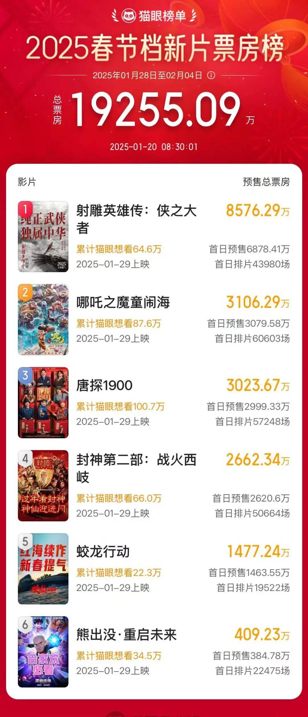 其中,《射雕英雄传:侠之大者》预售成绩最好,已经达到8576万,要破亿了。排名第二的是《哪吒之魔童闹海》,有3106万。紧随其后的还有《唐探1900》,3023万。而《封神第二部:战火西岐》也有2662万。《蛟龙行动》略弱一些,只有,1477万。《熊出没:重启未来》409万,也算正常发挥吧。