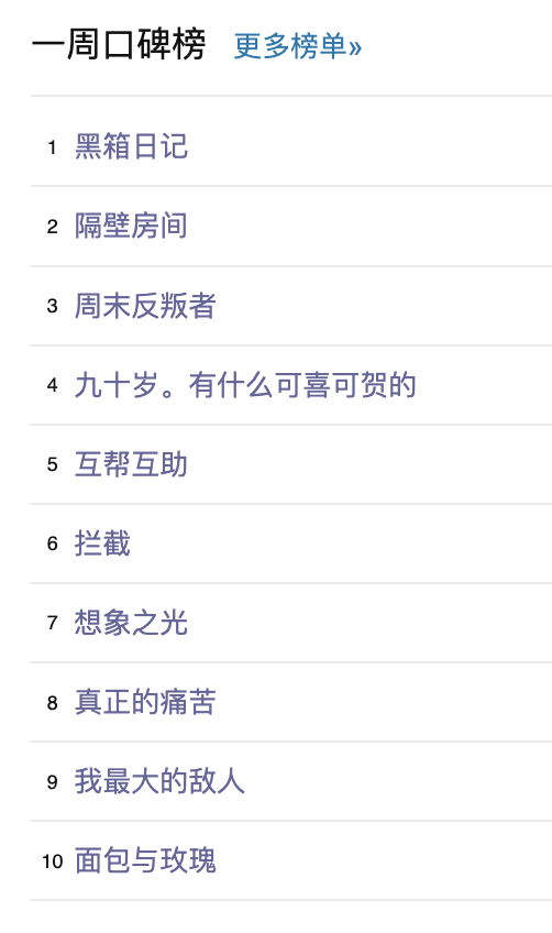 最后,还是例行附上一周豆瓣口碑榜的完整榜单: