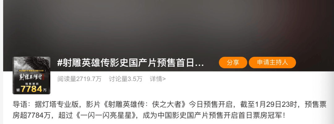 按淘票票的说法,截至1月19日23时29分,影片《射雕英雄传:侠之大者》预售总票房突破8000万,超过《一闪一闪亮星星》,成为中国影史国产片预售开启首日预售票房冠军,并超过《唐人街探案3》,成为中国影史春节档预售最快破8000万影片。