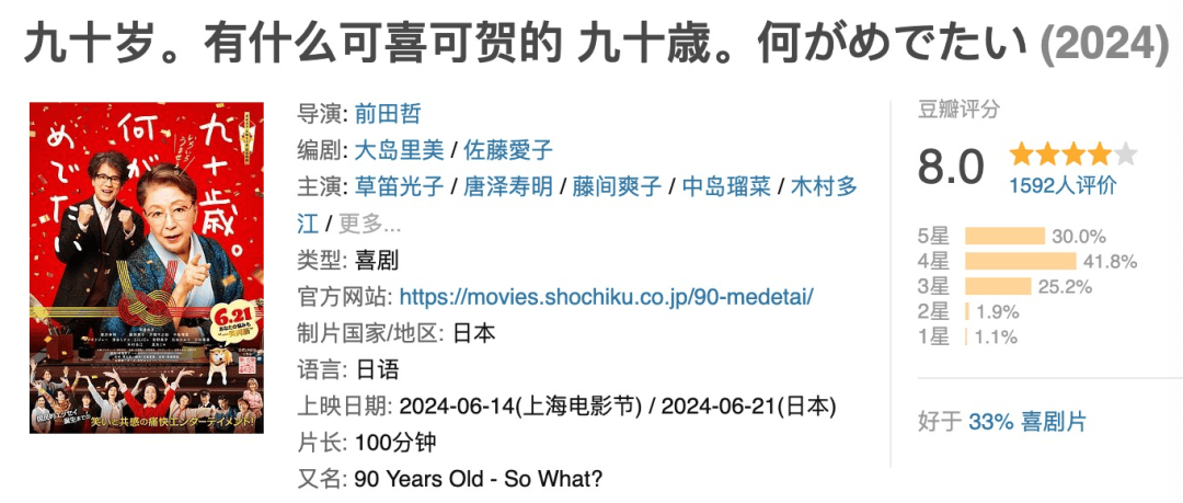 属于那种哭哭笑笑的片子,还是可以看看的。另外,本片的女主角草笛光子今年确实91岁了,倒是跟片名对上了。
