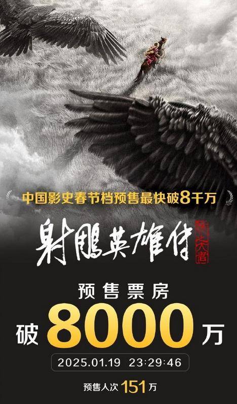 热烈庆祝!截至1月19日23时29分,《射雕英雄传:侠之大者》的预售总票房已经突破8000万大关!这部影片不仅在首日预售中力压《一闪一闪亮星星》,荣登中国影史国产片预售票房冠军,更以迅雷不及掩耳之势超过了《唐人街探案3》,成为春节档预售最快破8000万的影片。