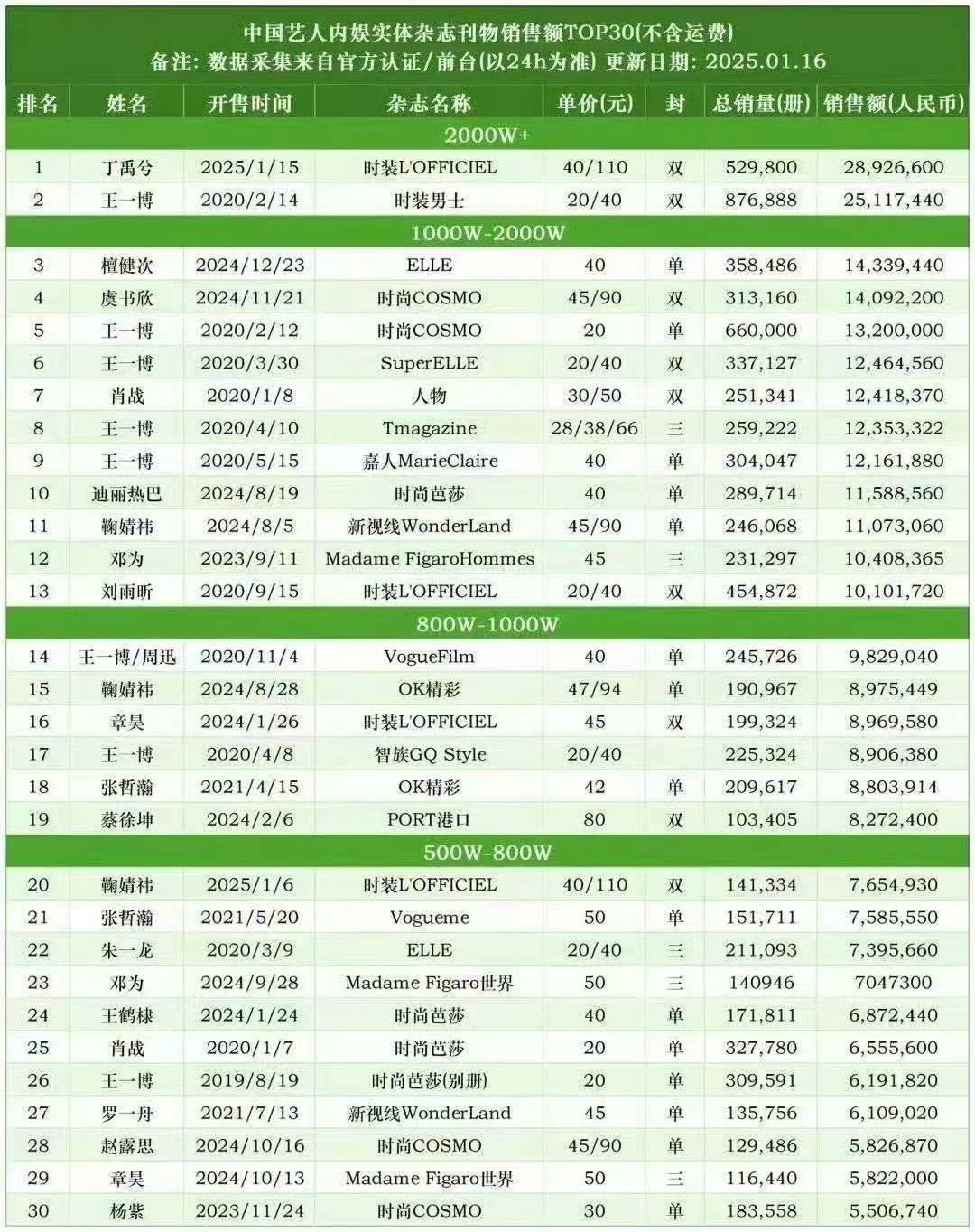 热议之下,丁禹兮的杂志最终销售额达到2892万。粉丝附上了“中国艺人内娱实体杂志刊物销售额TOP30”表格,宣传丁禹兮的杂志销售额登顶、打破纪录成为销量第一,超过了王一博5年前的数据。