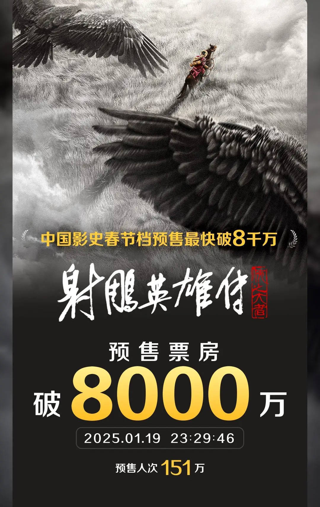 搜狐娱乐讯 据灯塔专业版实时数据,截至1月19日23时29分,电影《射雕英雄传:侠之大者》预售总票房突破8000万,超过《一闪一闪亮星星》,成为中国影史国产片预售开启首日预售票房冠军,并超过《唐人街探案3》,成为中国影史春节档预售最快破8000万影片。