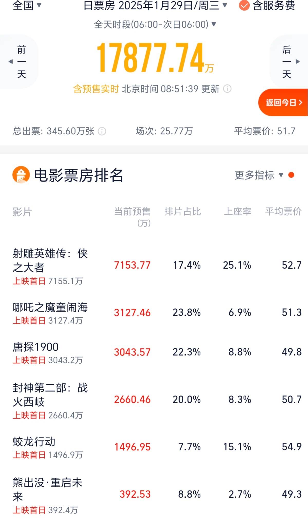 在淘票票,大年初一预排片《哪吒之魔童闹海》《唐探1900》《封神第二部:战火西岐》《射雕英雄传:侠之大者》《熊出没·重启未来》《蛟龙行动》各23.8%、22.3%、20.0%、17.4%、8.8%、7.7%,从当前预售来看,《射雕英雄传:侠之大者》上座率暂最高,《蛟龙行动》第二。