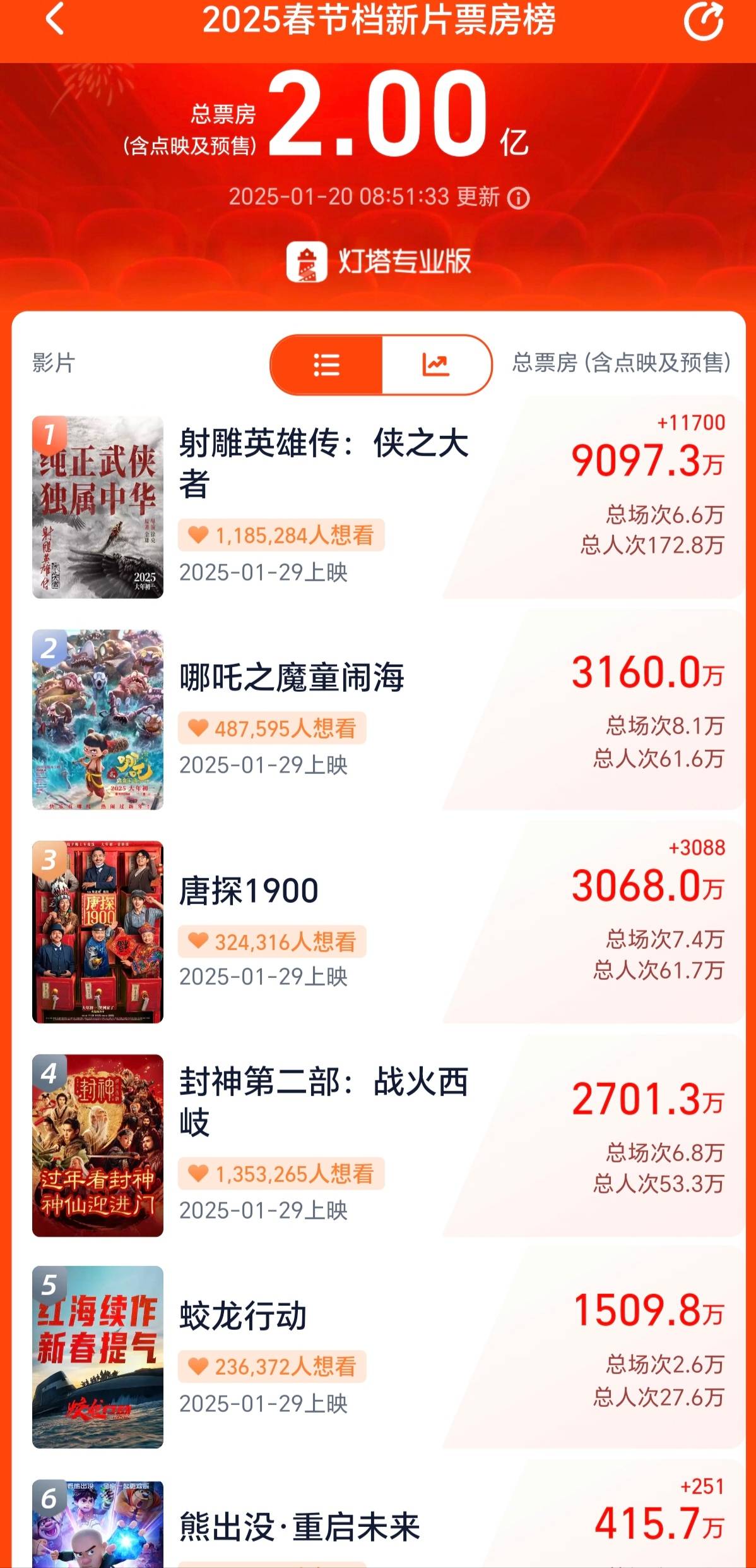 《哪吒之魔童闹海》《封神第二部:战火西岐》《唐探1900》预售各约3200万元、3100万元、2700万元,排在第二梯队。