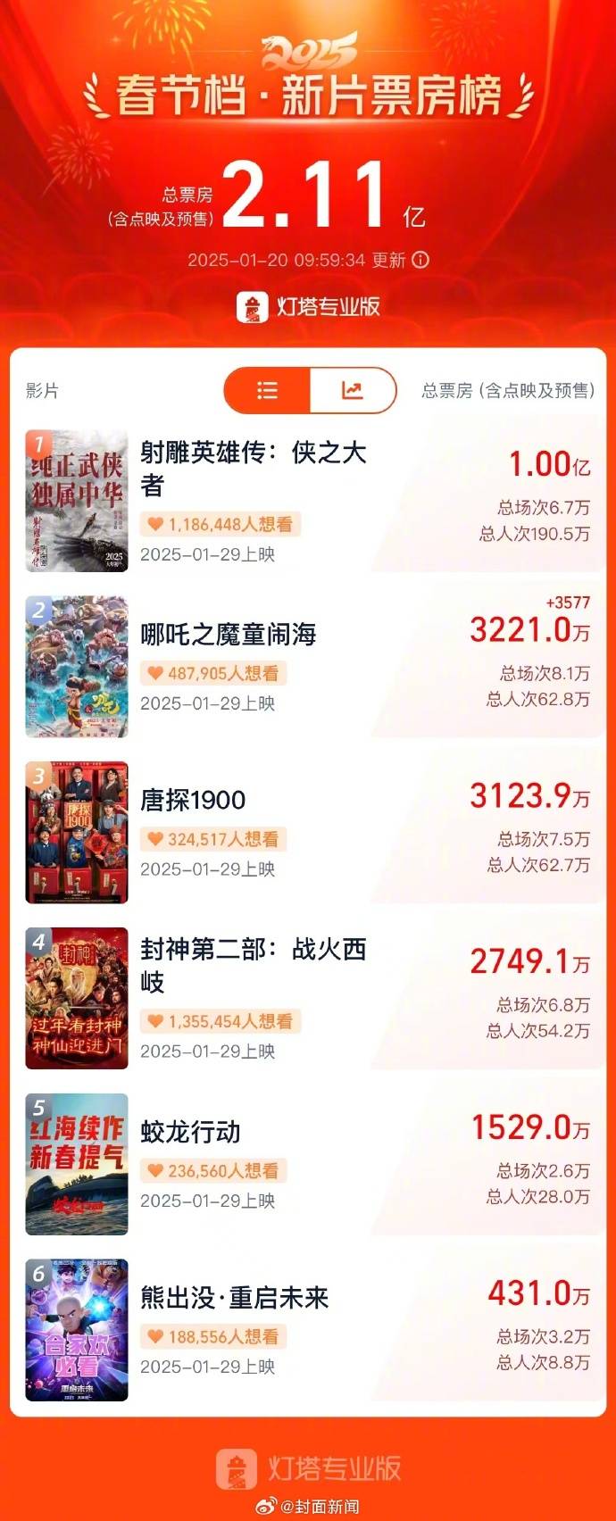 比如《熊出没》是系列电影,之前多年参战春节档,虽然不去争金夺银,但是孩子们的最爱,后劲十足,票房都不差。《哪吒》也是大家很熟悉的题材,之前一部电影口碑和票房双丰收。《蛟龙行动》是之前口碑票房不错的《红海行动》的姊妹篇,阵容豪华卖点不少。陈思诚的《唐探1900》也是系列电影的第四部,之前的口碑褒贬不一但票房都不差,有一定的受众基础。《封神》也是很经典的神话题材大家很熟悉,之前第一部的观感票房也不错,第二部自然也受期待。而《射雕英雄传》也是很熟悉的故事,大家期待如何改编,也期待徐克点拨下的肖战能有什么样的火花。