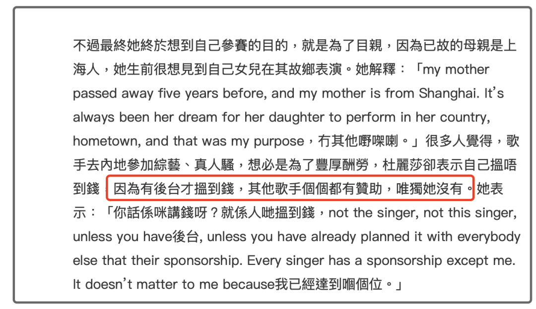但刚才我们也提到了,杜丽莎在内地的知名度太低,所以相对来说,她的商业价值也远远不如当时的其他参赛歌手,一开始杜丽莎来比赛时,以为就是简单的唱唱歌,然而,她后来发觉那并不只是纯粹要唱歌这么简单,她说比赛后才明白,来《歌手》唱歌不是一个人的事,是一个非常商业化的行业。