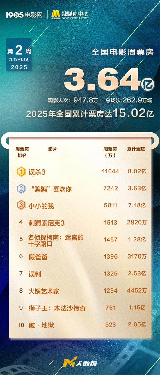 2025年第2周(1.13-1.19)全国电影周票房3.64亿元,观影人次超947.8万,2025春节档预售开启首日预售票房达1.67亿 ,2025全年电影票房累计15.02亿元 。