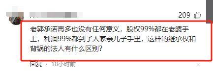 还有人说,老郭承诺再多也没有意义,就算他真的想补偿郭麒麟,但公司股权大多数都在后妈手里,利润自然而然地就给了亲儿子,这继承人跟“法人”还是没区别呀!