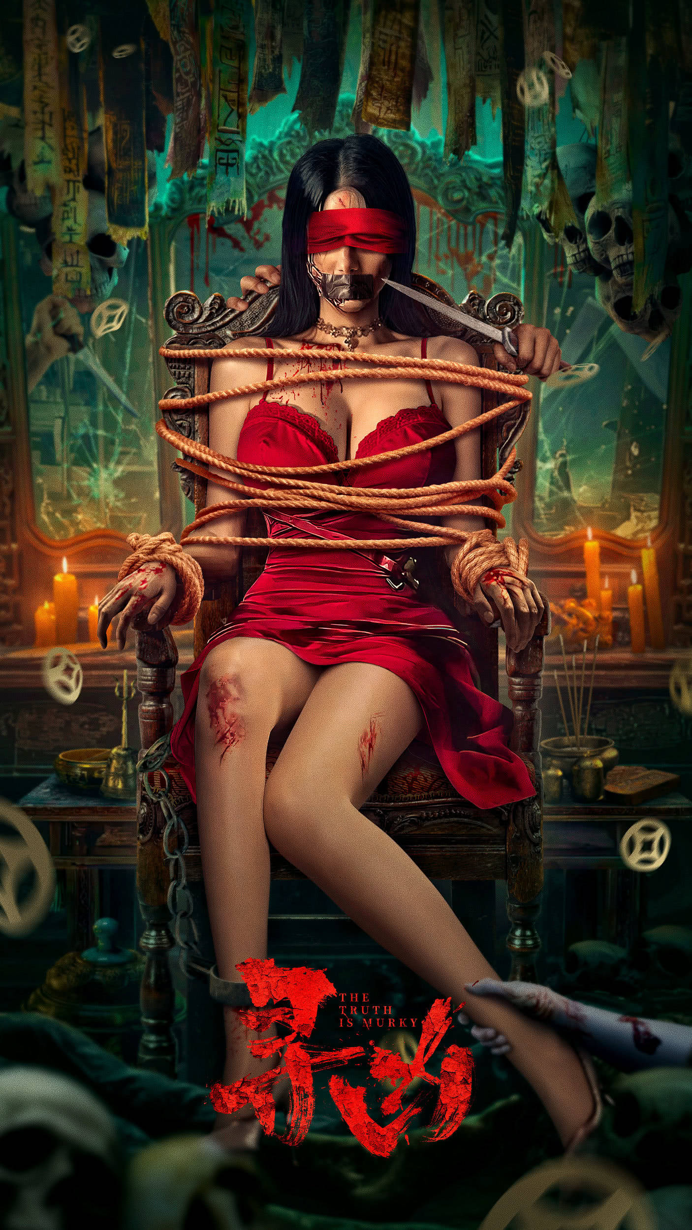 这两部电影的头图海报,都是一位女性,穿着红色的裙子,换言之,更像是穿着红色的泳衣,因为海报当中,女主的肩膀及其周边部位,都是能露出来的尽量露出来了,而下方,则是露出大腿,允许露出来的,都露出来。并且,这两部网络电影的海报,都是将这位女性进行了捆绑处理。