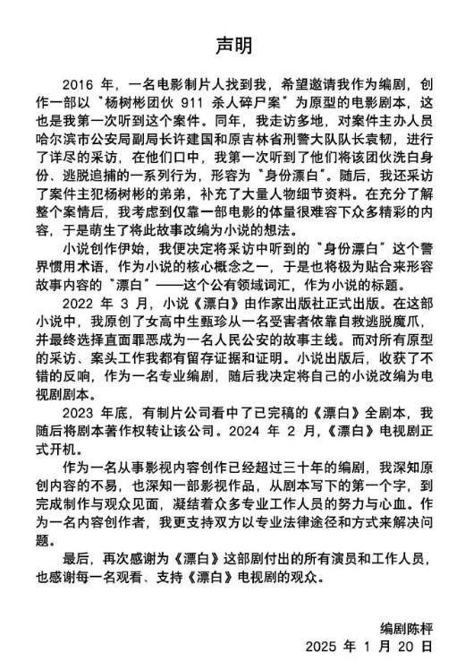 近日,《漂白》编剧陈枰针对抄袭传闻做出了回应。她坚定否认了相关指控,并表示希望双方能通过专业法律途径解决争议。陈枰分享了自己创作的心路历程:“小说出版后反响热烈,作为一名专业编剧,我决定将这部作品改编成电视剧。”