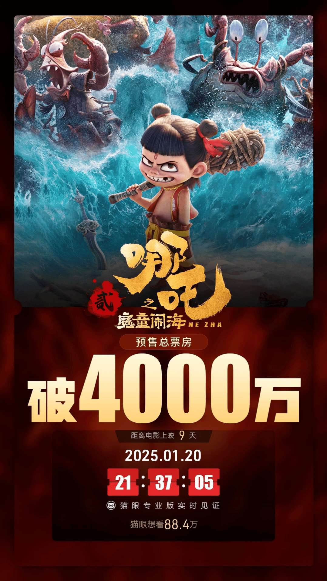 春节档动画续集电影《哪吒之魔童闹海》映前第9天 预售总票房突破4000万 - 超景影院