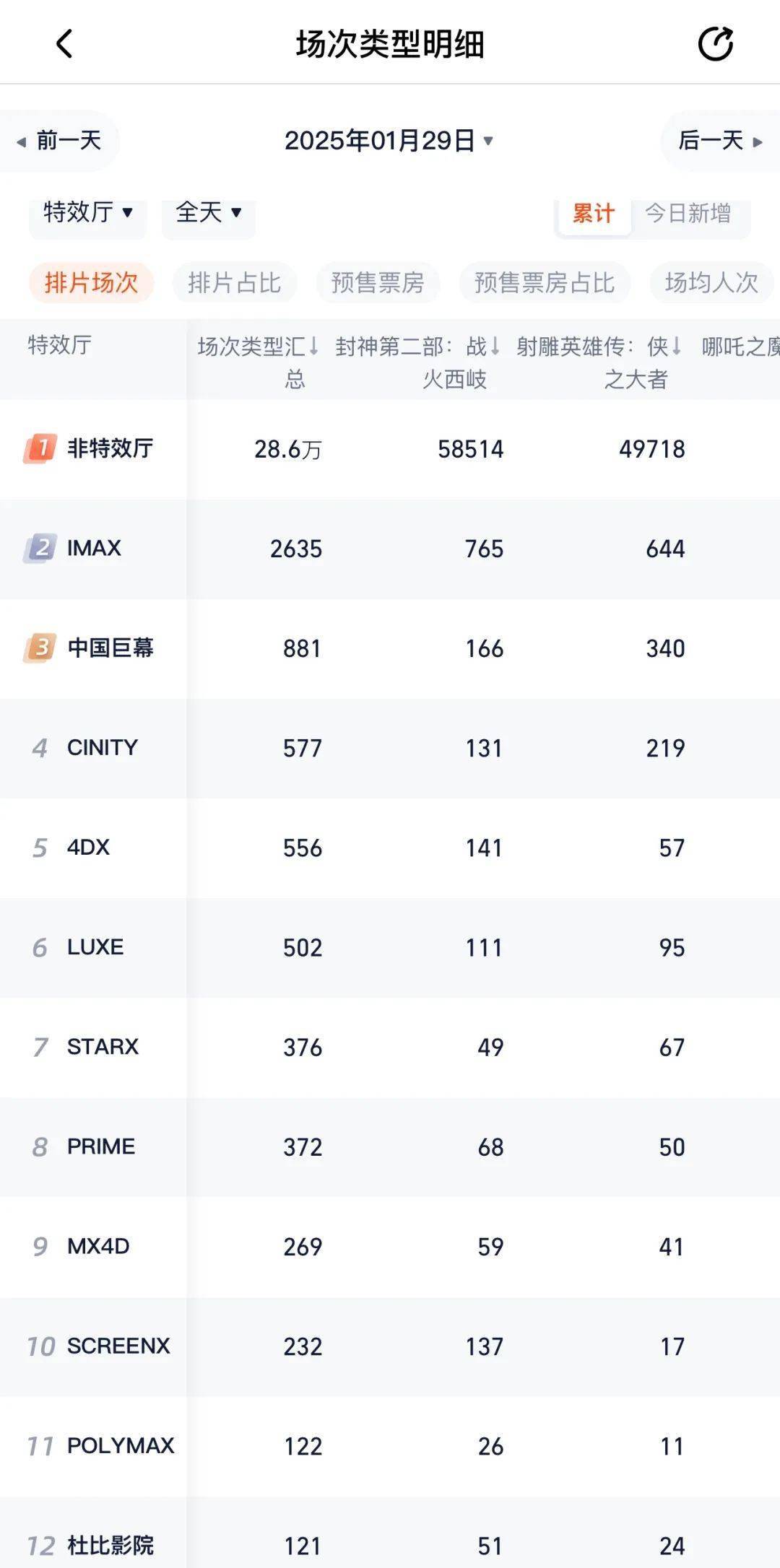 等到春节档正式到来,从大年初一开始,影院都会根据每一天影片的票房和口碑表现,不断调整变化特效厅的排片比例,所以这块战场还有得“打”。