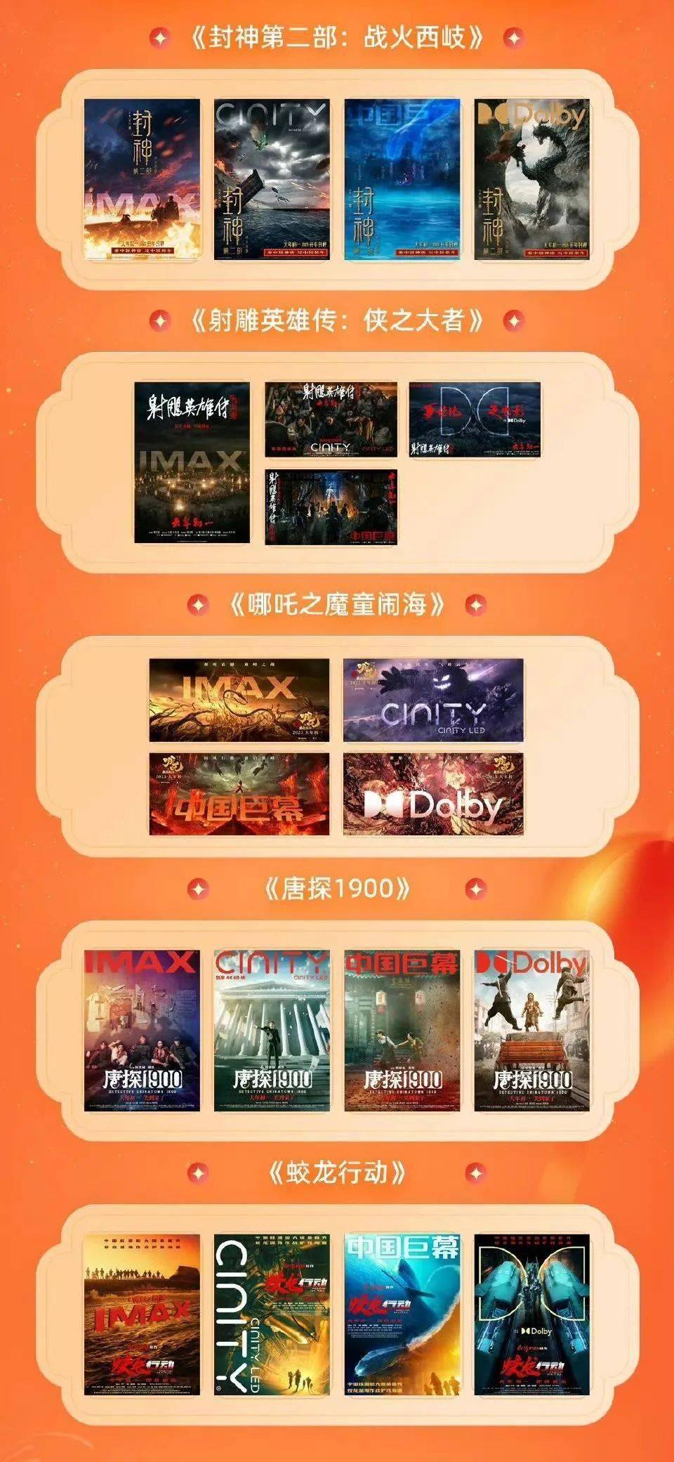 根据发行版本信息显示, 《封神第二部:战火西岐》《蛟龙行动》《射雕英雄传:侠之大者》《唐探1900》《哪吒之魔童闹海》5部影片将上映IMAX、CINITY、中国巨幕、杜比视界等全制式,《熊出没·重启未来》也将推出CINITY、中国巨幕两类特效制式上映。
