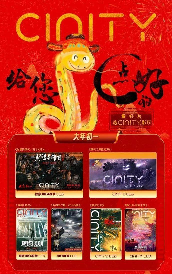 从大年初一中国巨幕和CINITY特效厅排片来看,《射雕英雄传:侠之大者》都拿下最高的排片占比,都超过30%。其后是《哪吒之魔童降世》与《封神第二部:战火西岐》。