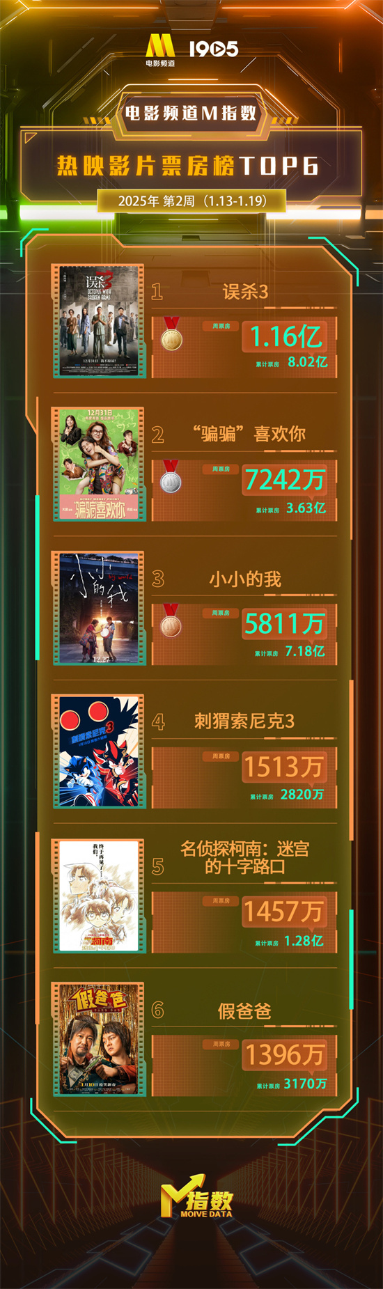 “电影频道M指数”2025年第2周结果发布。1月13日-1月19日,“电影频道M指数”热映影片票房榜前6位依次为: