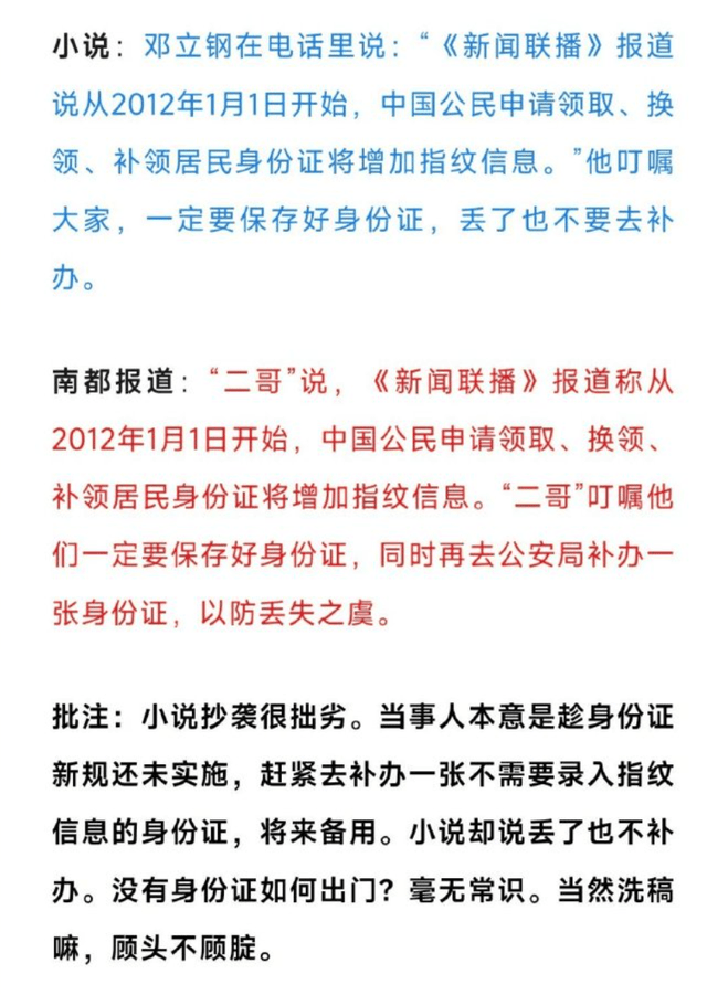还有比较有意思的一点,小说中邓立钢警告同伙,说要用二代身份证,会增加指纹信息,警告大家要保存好身份证,丢了也不要去补办。