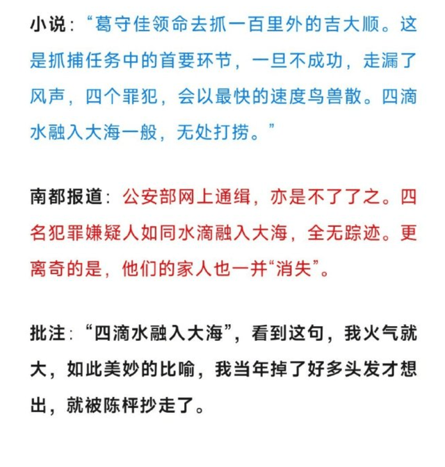 15处对比在这里不详细展开,挑一些重点内容介绍一下。比如文中指出陈枰的原著小说用了“四滴水融入大海一般,无处打捞”,而当时的报道写的是“四名犯罪嫌疑人如同水滴入大海,全无踪迹”,两者的比喻几乎一样,按照猛哥的说法就是“如此美妙的比喻,我当年掉了好多头发才想出,就被陈枰抄走了。”