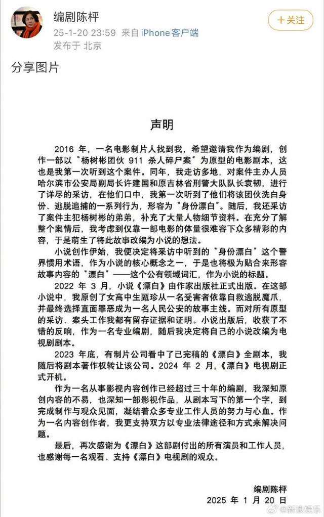 很快剧方回应称是改编自陈枰在几年前出版的同名小说,而陈枰也发声明回应称,自己是应电影制片人邀约,创作以杨树彬团伙911杀人碎尸案为原型的电影剧本,为此他走访多地,对案件主办人员进行了详尽的采访,同时还采访了杨树彬的弟弟,补充了大量人物细节资料。并进而将故事改编为小说。小说出版后,才有了新的契机改编成电视剧剧本,并在2024年2月份开机,也就是目前正在热播的《漂白》。