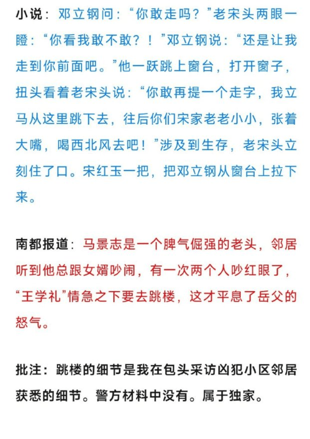 此外,除了大量细节桥段的雷同,还有猛哥所说的“独家”采访内容也被陈枰用上了。比如小说中写邓立刚跳上窗台,威胁对方跳楼,而原报道也有类似的桥段,猛哥称跳楼的细节是他在包头采访凶犯小区邻居获悉的细节,警方材料中没有,属于独家。