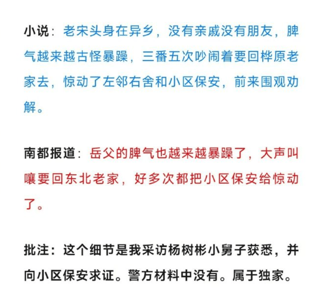 还有小说中“老宋头”脾气暴躁古怪,三番五次吵架惊动了左邻右舍和小区保安,原报道中也有几乎一模一样的桥段,这里猛哥透露是他采访了杨树彬小舅子获悉,并向小区保安求证。警方材料中没有,属于独家内容,但同样被陈枰用在了小说中。