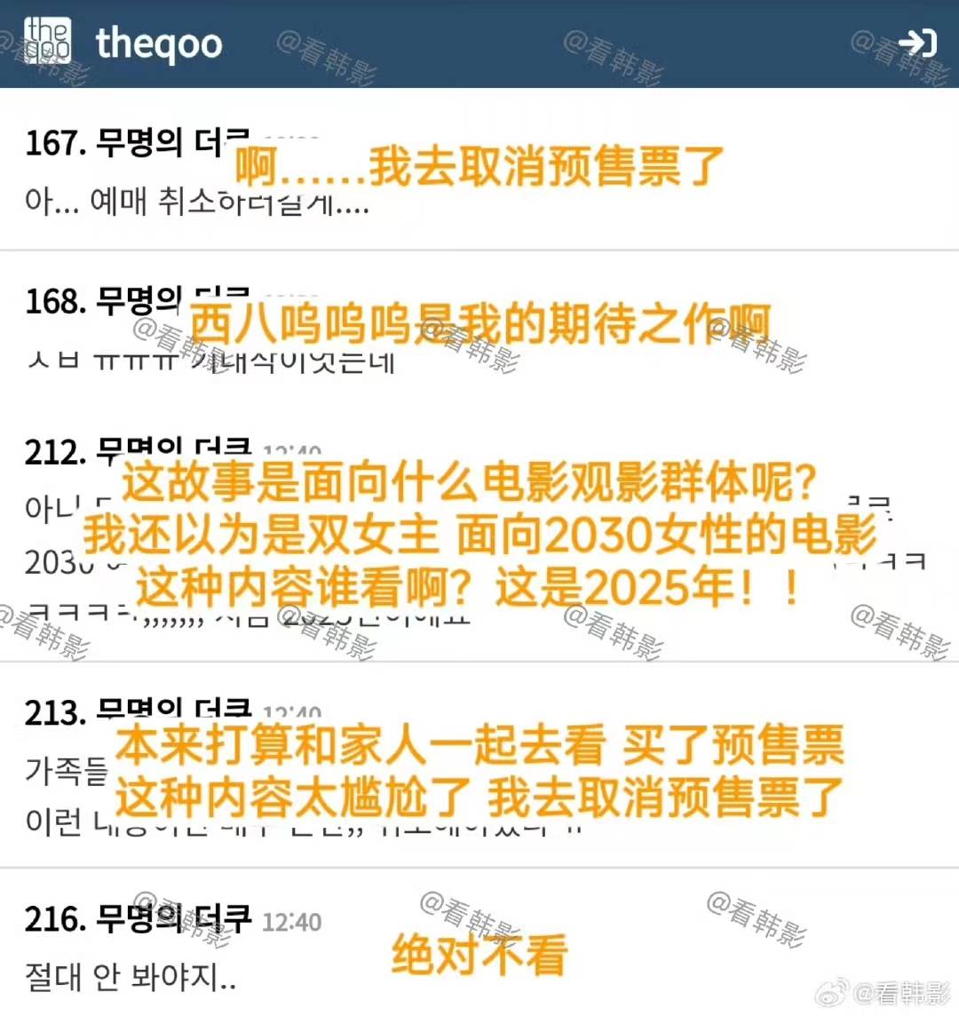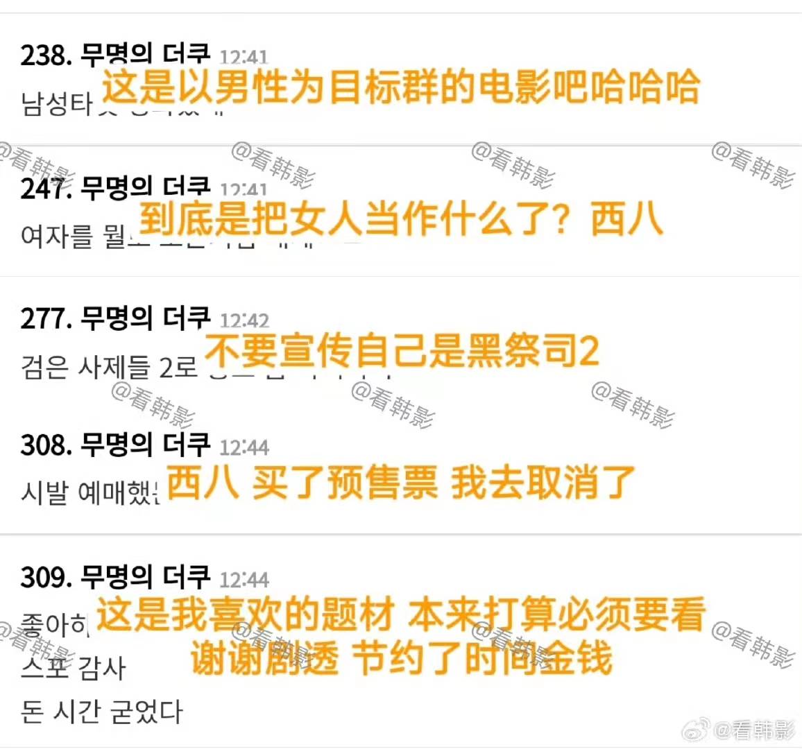 不少韩国网友表示本来想一家人去看,但内容不适合,还是放弃观影,认为题材审美很落伍,都什么年代了,还表现这种没有智商的情节,很难服众。