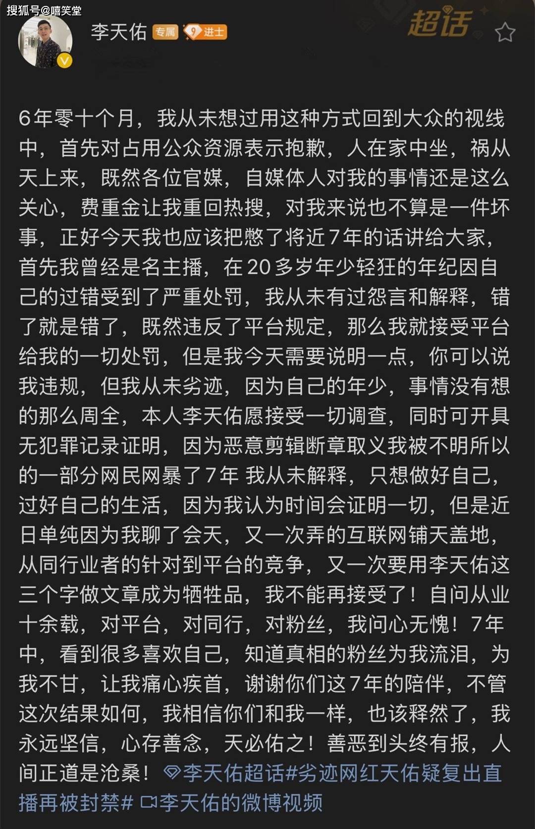 而天佑也发出长文回应,公开为自己辩解,表示自己七年来遭到了恶意剪辑,被断章取义了。