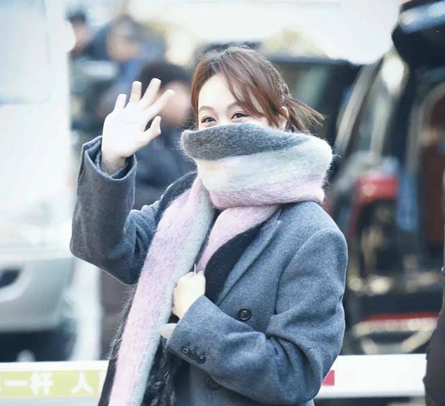 姜妍穿着灰色大衣,戴着围巾,微笑和大家打招呼,甜美又温柔。