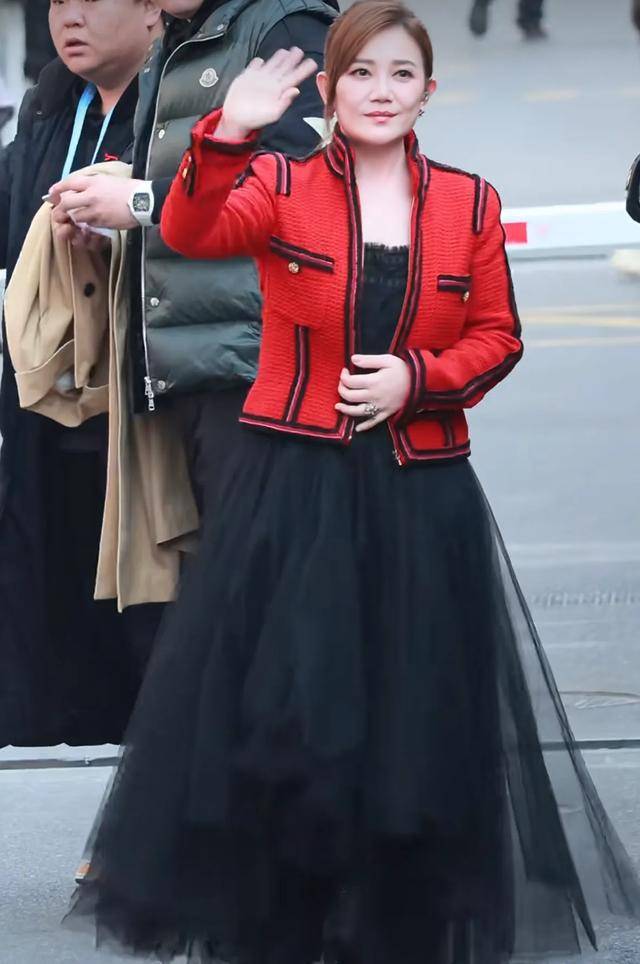 歌手梁静茹穿着红色的小香风上衣搭配黑色纱裙,看起来特别漂亮。