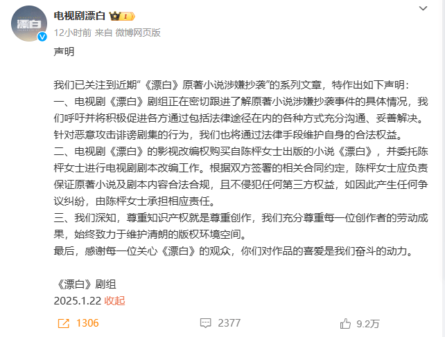 我们已关注到近期“《漂白》原著小说涉嫌抄袭”的系列文章,特作出如下声明: