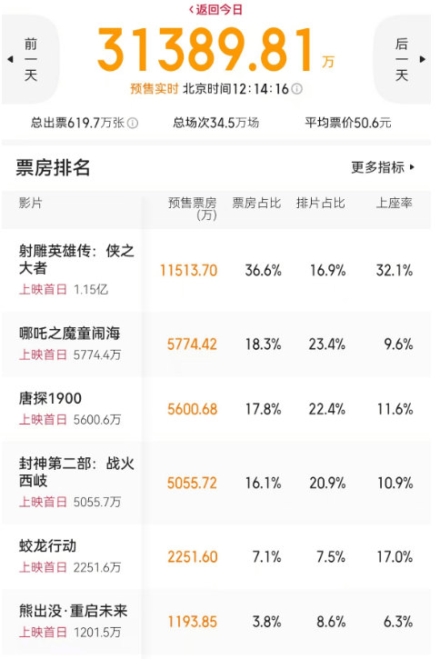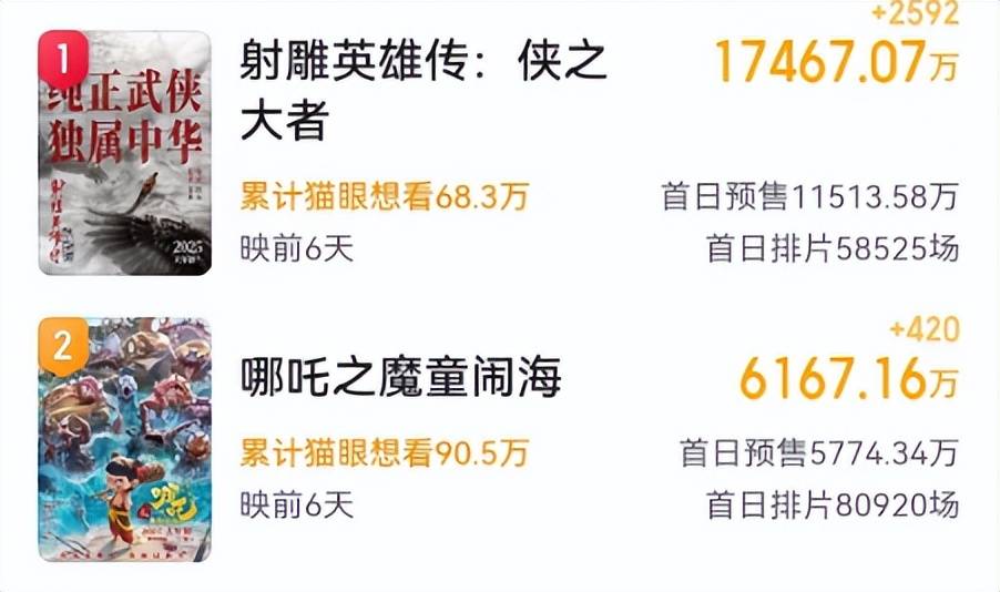 对比预售刚开始时的排片占比,《射雕英雄传:侠之大者》从17.3%跌至目前的16.9%,《哪吒之魔童闹海》也从23.8%降至23.4%,原本就不高的《蛟龙行动》和《熊出没:重启未来》也进一步下调,把场次让给了《封神第二部:战火西岐》,于是《封神2》从最初的19.8%涨至20.8%,多了百分之一。