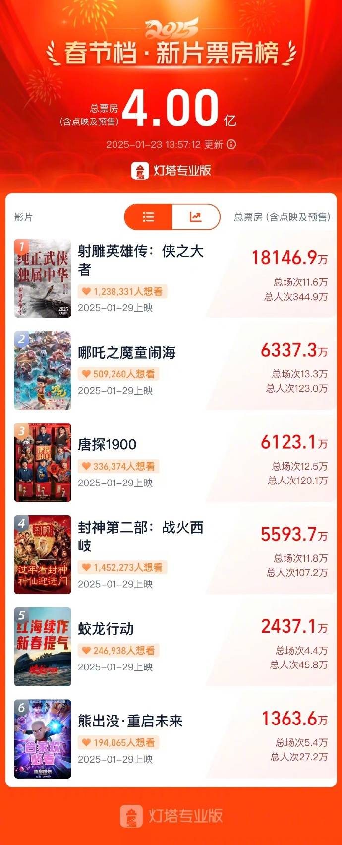 搜狐娱乐讯 1月23日,据灯塔专业版数据显示,截至今天14时6分,2025春节档新片票房总预售突破4亿,仅用时4天5小时6分,刷新中国影史春节档预售最快破4亿纪录。其中预售票房第一名仍为《射雕英雄传:侠之大者》,票房破1.8亿,第二名《哪吒之魔童闹海》破6300万,第三名《唐探1900》破6100万。
