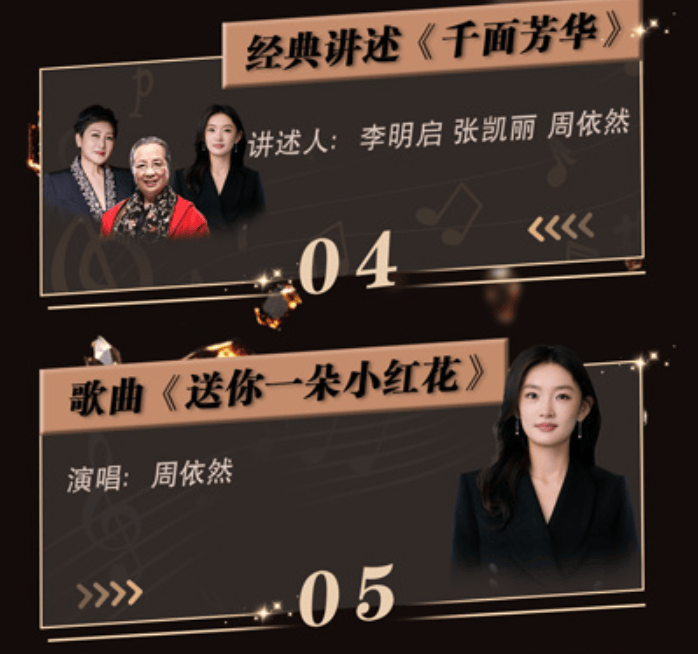 第二个是周依然。她不但被安排和李明启、张凯丽两位老一辈艺术家一起完成经典讲述《千面芳华》,还有一个独唱《送你一朵小红花》的机会。周依然也不是体制内的演员,没演过话剧舞台剧,他的资源主要来自经纪公司大隐光时,公司老板梁砚很低调但非常厉害,他从华谊兄弟出来,曾是冯绍峰的经纪人,在这个行业人脉甚广、资源很强,所以容貌不算出众的周依然一直不缺戏拍。