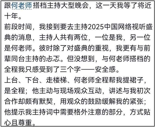 近期和何炅一起录制了网络视听盛典的女主持人就提到何炅一直照顾自己,不光全程帮她提裙子,还要帮她缓解紧张、提醒注意主持词。