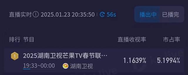 ——开场一小时,湖南台春晚收视率峰值稳稳破1%,市占率破5%。