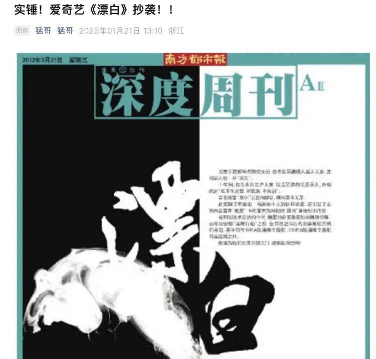 1月20日,前南方都市报记者王猛发文称爱奇艺电视剧《漂白》抄袭南方都市报的报道《漂白》:“《漂白》创作团队事先没有联系我或南方都市报,在宣发材料中,也没有标示原作出处。”