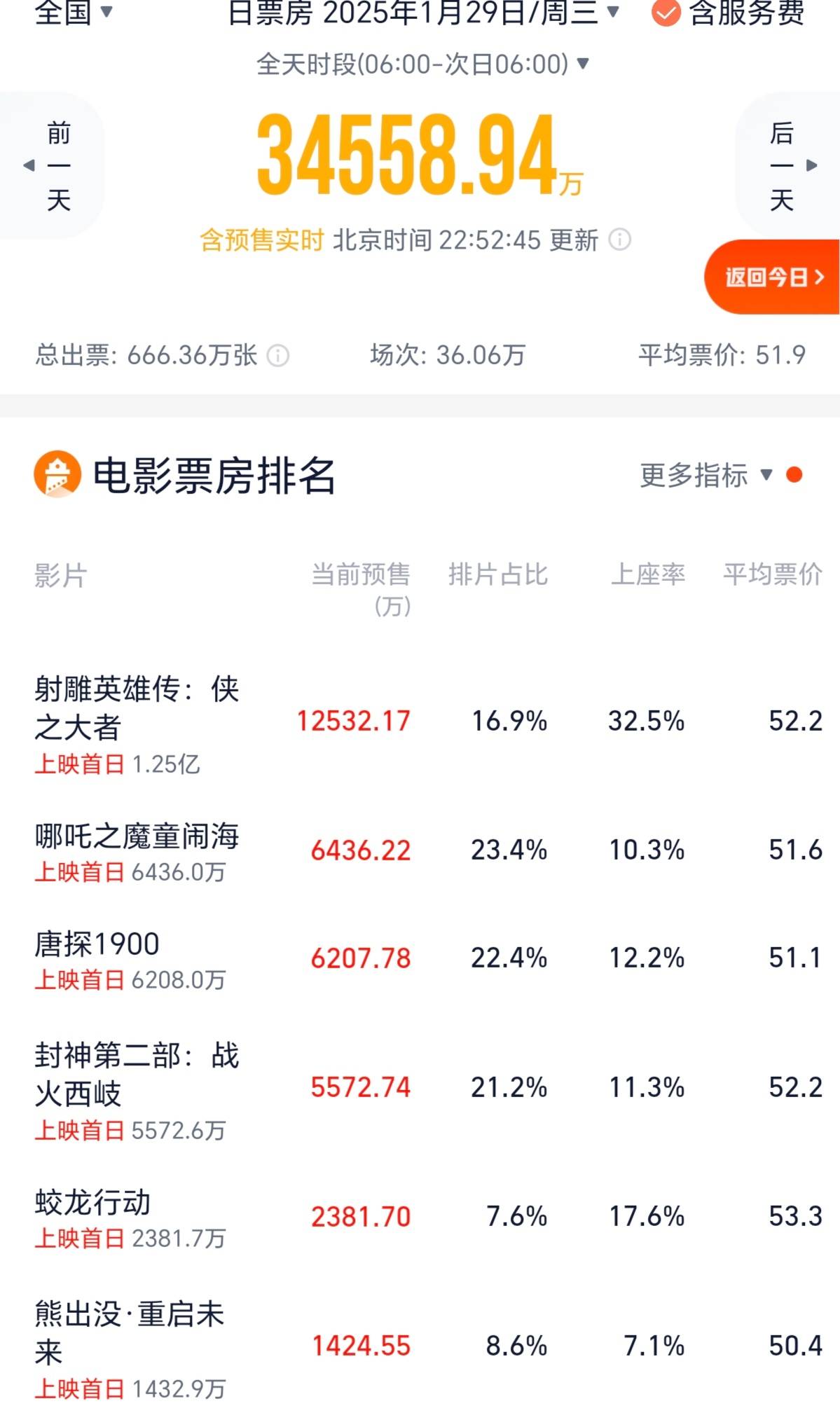 在淘票票,大年初一预排片《哪吒之魔童闹海》《唐探1900》《封神第二部:战火西岐》《射雕英雄传:侠之大者》《熊出没·重启未来》《蛟龙行动》各23.4%、22.4%、21.2%、16.9%、8.6%、7.6%,从当前预售来看,《射雕英雄传:侠之大者》上座率暂最高,《蛟龙行动》第二。